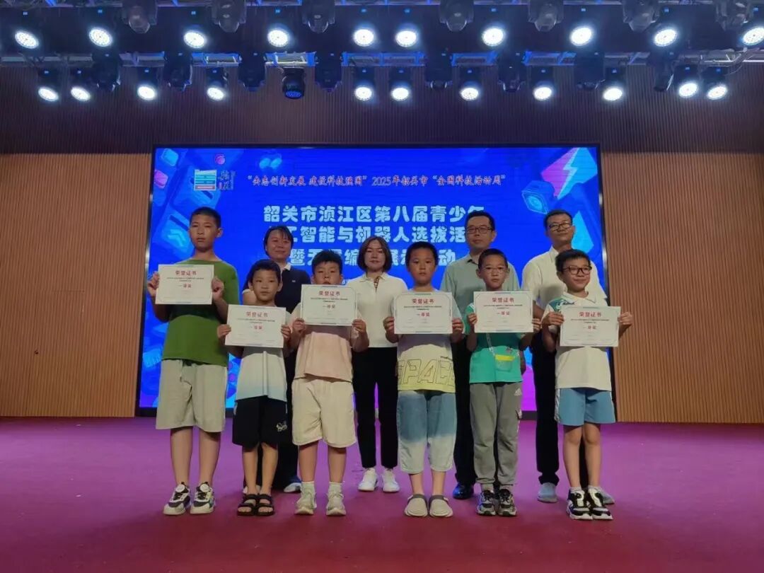 在科技浪潮奔涌向前的时代,青少年儿童正通过人工智能与机器人技术叩响未来之门。6月9日,乳源青少年宫组织科技班7名学员参加韶关市浈江区第八届青少年人工智能与机器人选拔活动暨无屏编程展示活动,他们以智慧为剑、以创新为盾,在"优创未来""星弈行动""无屏编程交流活动"三大赛道上,经过激烈角逐: