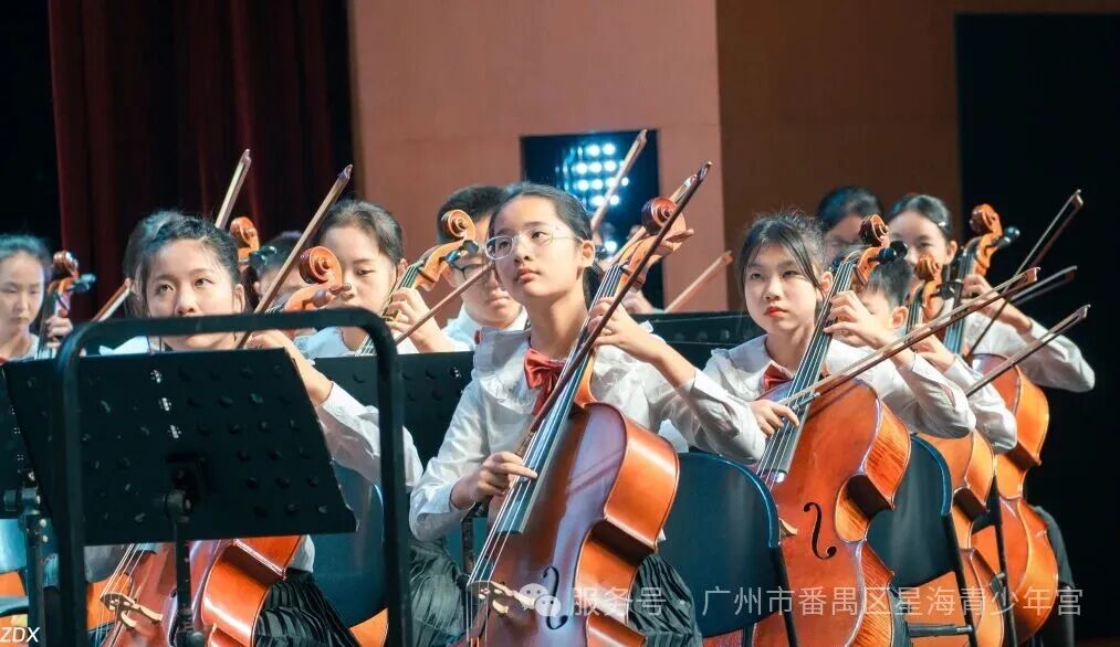 随后,乐团成长视频缓缓展开时光画卷:自2016年成立以来,星海青少年宫在番禺区多所学校、幼儿园设立乐团教育基地,将优质艺术资源辐射校园,为区域音乐普及与器乐人才培养注入源源不断的动力。紧接着,番禺区北城幼儿园、番禺中学附属幼儿园的孩子们带来弦乐合奏《幸福弦歌》,稚嫩琴音里满是艺术启蒙的纯真与希望,打动了在场每一位观众。