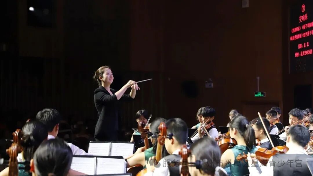 音乐会的重头戏,当属星儿交响乐团的再度登场。在指挥孟珑老师的执棒下,乐团先是以《红色娘子军》组曲选段《万泉河水》《娘子军操练舞》、舞剧《沙湾往事》选段《粤海采风》《雨打芭蕉》串联起民族音乐脉络,经典旋律唤起共鸣;随后,乐团特别带来委约作品《星海之音》,这部作品由著名作曲家杜克先生创作,其灵感正源自冼星海的经典旋律。星儿交响乐团用动人乐章彰显“星海精神”的代代相传。音乐会尾声,星儿交响乐团与星儿合唱团联袂献演宫歌《星星海》,悠扬音乐与嘹亮歌声交织,将对星海青少年宫二十周年的祝福融入每一个音符。