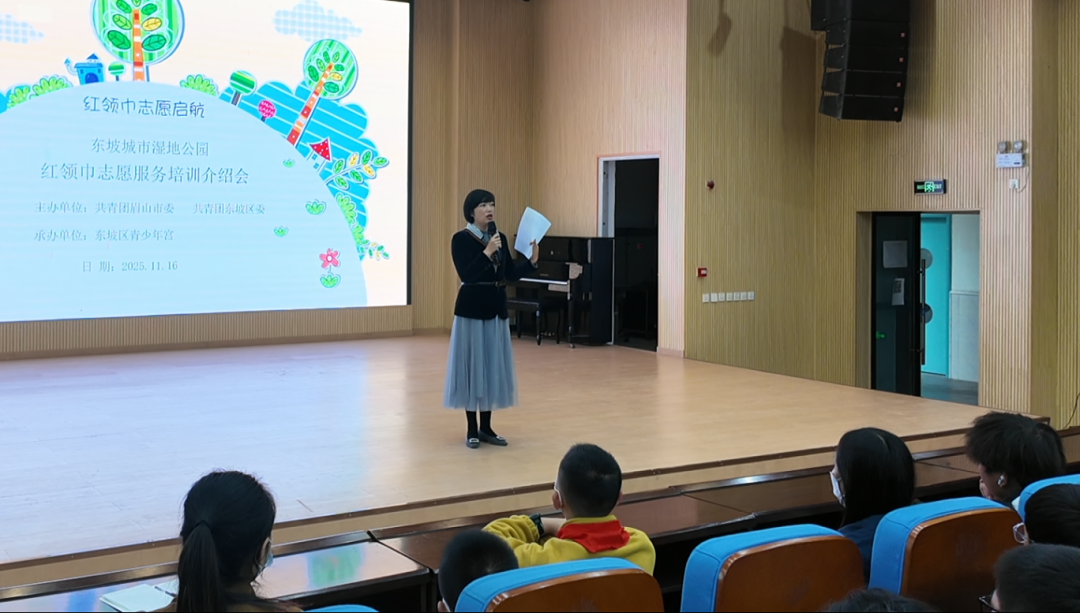 由共青团眉山市委、共青团东坡区委主办,东坡区青少年宫承办,依托东坡城市湿地公园打造的“红领巾志愿服务体验岗”,于11月16日在苏洵小学开展了2025年东坡城市湿地公园新晋红领巾志愿者(第二批)培训,300余名志愿者及家长参与了本次活动。