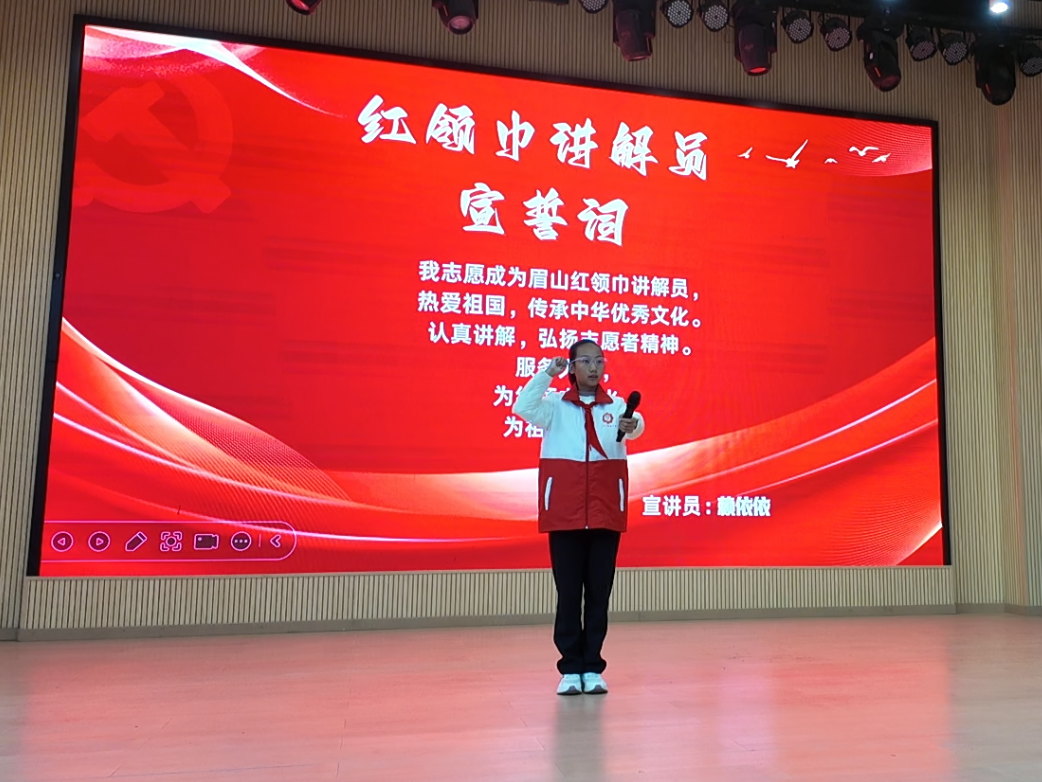 培训会上,老师为大家详细介绍了活动流程和服务内容,我们特别邀请了三苏祠优秀红领巾讲解员赖依依同学进行示范讲解。小讲解员以声情并茂的示范讲解征服了现场所有人,热烈的掌声此起彼伏,尽显新时代少先队员的蓬勃朝气。随后,全体志愿者高举右拳庄严宣誓,承诺坚守传承中华优秀传统文化的初心,大力弘扬志愿者精神。