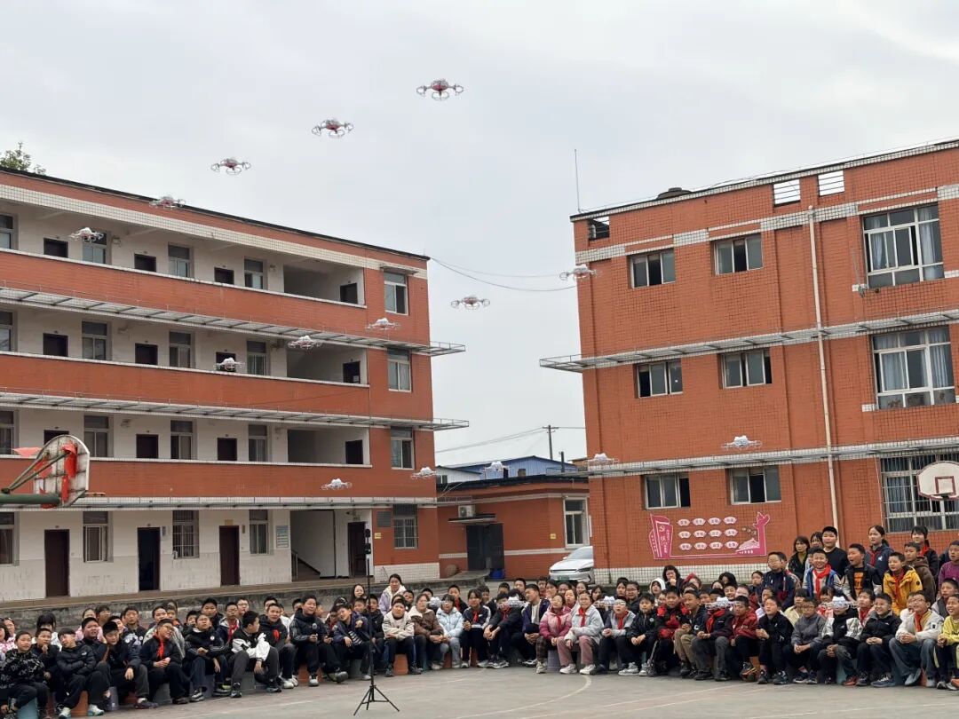 活动现场,无人机编队率先亮相,成为全场焦点。一架架无人机平稳升空,在天空中灵活变换造型,时而舒展成优美线条,时而集结成整齐阵列,炫酷的空中表演让孩子们目不转睛,阵阵惊叹声回荡在校园之中。