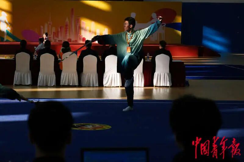11月23日,上海金山区,2024年全国青少年传统体育项目比赛全国总决赛正在举行。在武术赛场,一名参赛选手正在进行武术器械类比赛。中青报·中青网记者 田嘉硕/摄