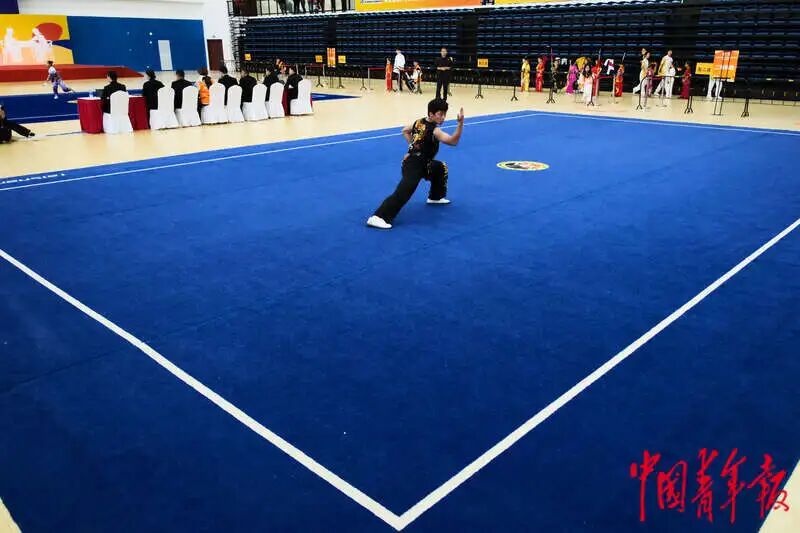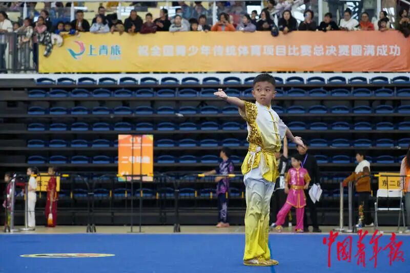 11月23日,上海金山区,2024年全国青少年传统体育项目比赛全国总决赛正在举行。在武术赛场,一名参赛选手正在进行武术拳术比赛。中青报·中青网记者 田嘉硕/摄