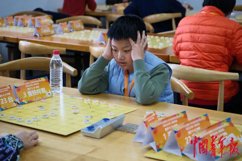 11月23日,上海金山区,2024年全国青少年传统体育项目比赛全国总决赛正在举行。在象棋赛场,一名抱头思考的小选手。中青报·中青网记者 田嘉硕/摄