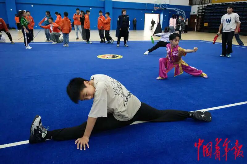 11月23日,上海金山区,2024年全国青少年传统体育项目比赛全国总决赛正在举行。在武术赛场,参赛选手们正在热身。中青报·中青网记者 田嘉硕/摄