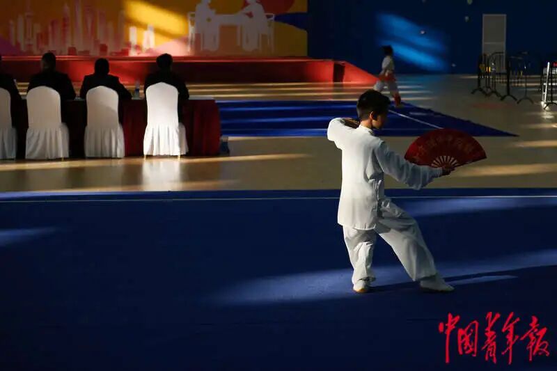 11月23日,上海金山区,2024年全国青少年传统体育项目比赛全国总决赛正在举行。在武术赛场,参赛选手正在进行武术太极扇比赛。中青报·中青网记者 田嘉硕/摄