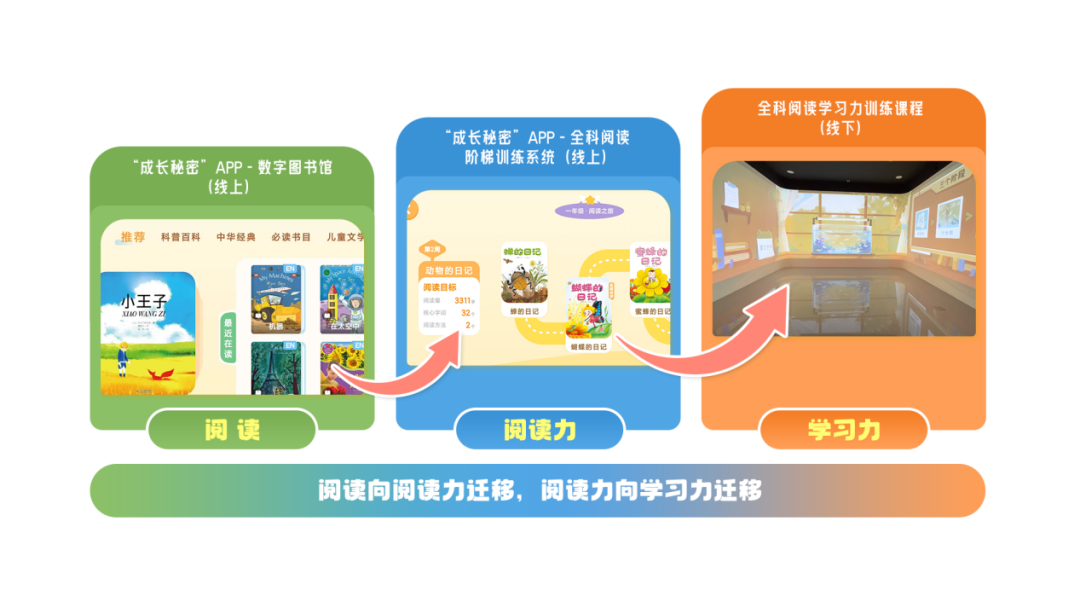 在成长秘密线下科技阅读馆,拥有一套系统的儿童全科阅读解决方案。首先,通过【成长秘密儿童阅读与学习力测评】,可以诊断出孩子当下的阅读与学习力发展水平,找到孩子的阅读与学习痛点、优势和短板。然后再根据孩子的个体情况,在【全科阅读馆APP】和【全科阅读阶梯训练系统APP】针对性地进行阅读力训练,通过大量阅读、广泛阅读、精读训练帮助孩子系统养成阅读力。最后,在【全科阅读学习力训练课程】中,大量采用了国际最先进的阅读教育理念和方法,通过跨领域、全学科、情境化、主题式的阅读训练针对性地培养孩子向未来的15项学习力。通过这样系统化的全科阅读方案一站式解决孩子的阅读测评、阅读力养成、学习力训练。