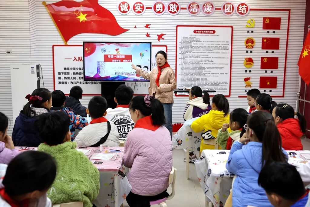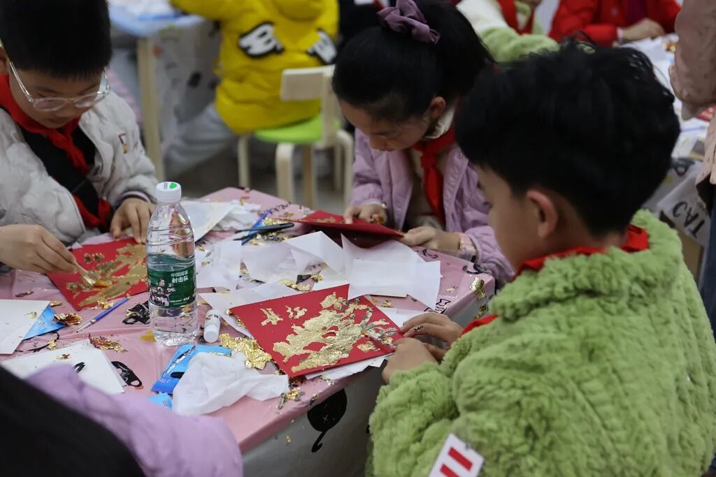 随后,武汉市青少年宫美育中队的辅导员夏老师带领小小讲解员们开启“非遗烧箔画—箔绘长征 梦启少年”沉浸式美术体验活动。大家用艳丽的色彩,描绘那段峥嵘岁月,感受革命先烈的英勇与无畏;用独特的烧箔工艺,再现那段不朽的传奇,铭记红军战士的坚定与执着;用少年人独有的想象力,筑起对美好未来的向往,传承长征精神的坚定理想与信念。